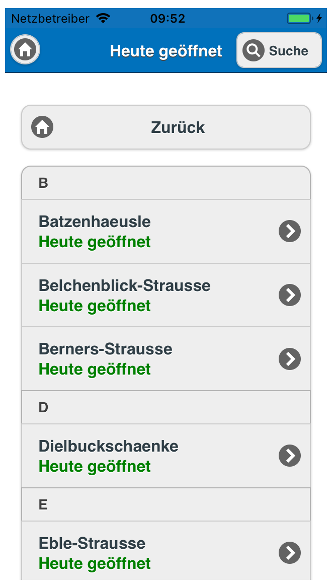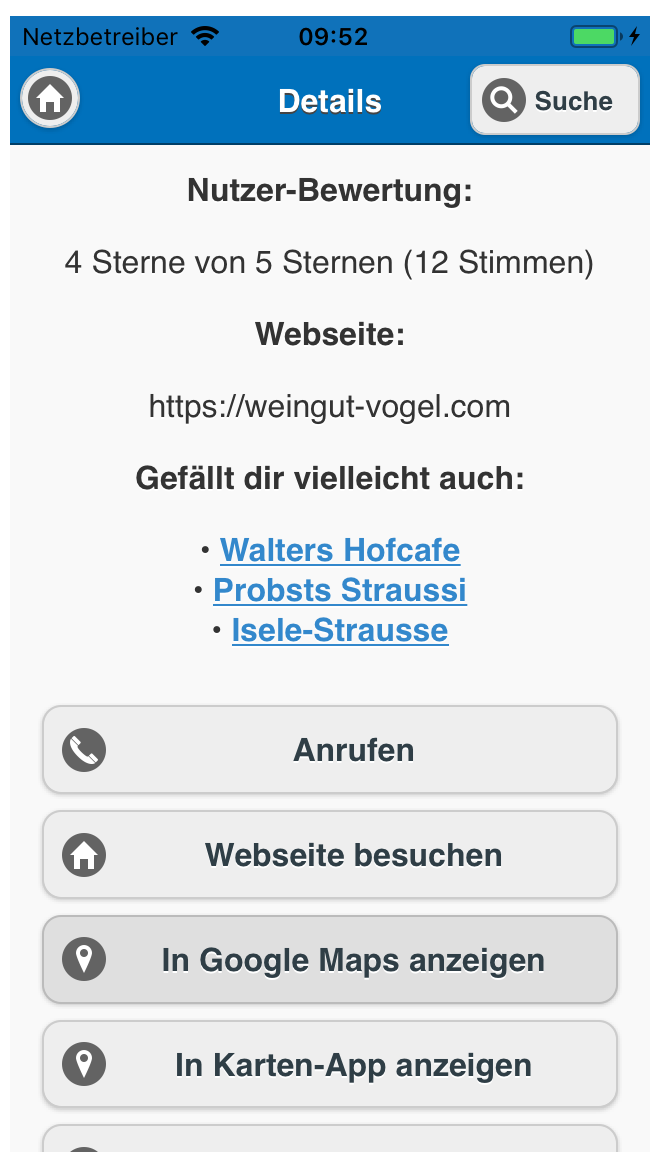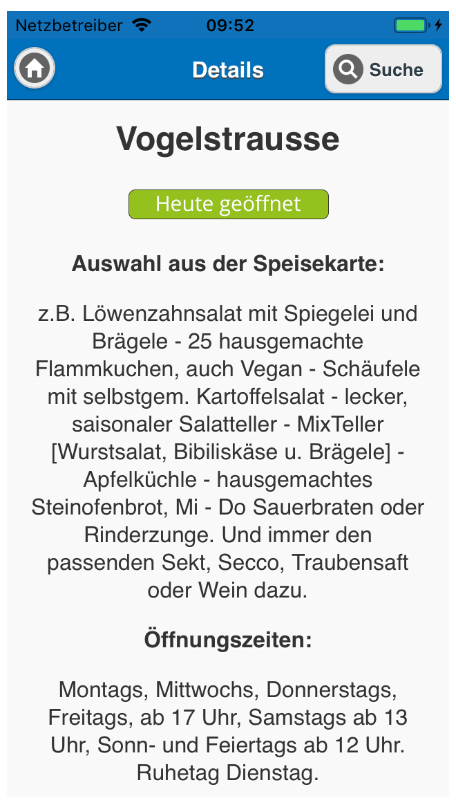 Sieh dir eine Auswahl der Funktionen an, die dich in deiner Straußenführer-App für Südbaden erwarten.